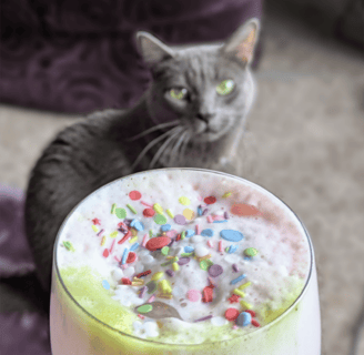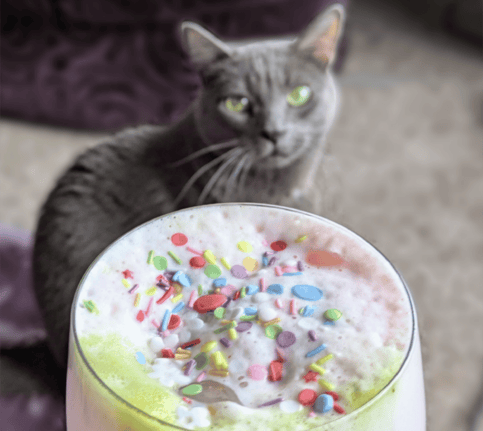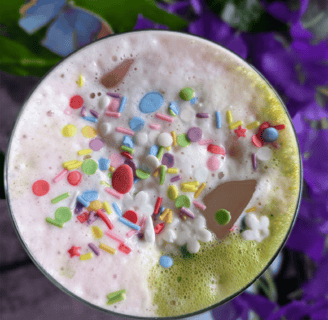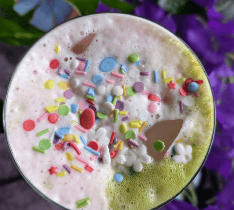 𖹭 Pour frothed milk/creamer over the matcha, then add sprinkles!